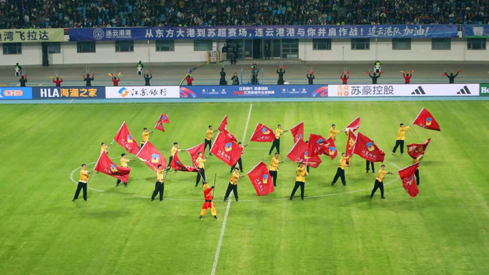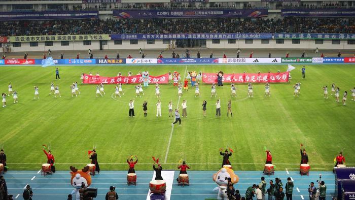 暖场表演分为四个篇章,近200名演职人员轮番上场,层层递进,气氛一浪高过一浪。开篇《鼓震山海》率先燃爆全场,大鼓手与小鼓手同频擂响鼓乐,震天鼓声呼应连云港“山海相拥”的城市特色。旗舞舞者踏乐起舞,刚健的身姿尽显港城奋勇争先的奋进姿态。紧随其后的《奔跑的青春》,啦啦操演员以元气满满的舞姿跳出了青春节拍进入《永远不回头》,主唱歌手用极具感染力的歌声传递永不言弃的体育精神,引来现场球迷齐声合唱,吉祥物人偶和洛丽塔互动人员穿梭于赛场,与现场球迷热情挥手互动。最终篇章《一起摇摆》将全场氛围推向最高潮,台上台下同频互动,整个体育场变成欢乐的海洋。