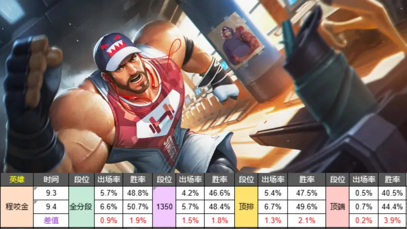 调整后程咬金全线胜率提升,顶端局不用看,全分段和巅峰赛涨幅都接近2%,顶排超过了2%,直接从一个垫底的状态拉到了一个中游的水平。