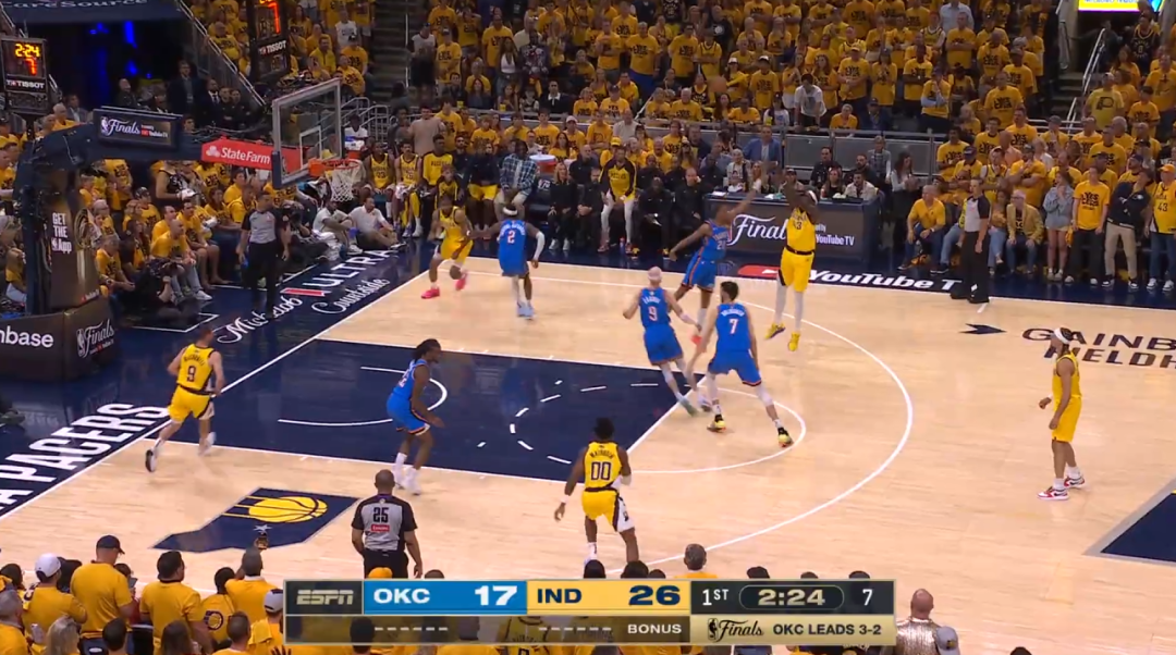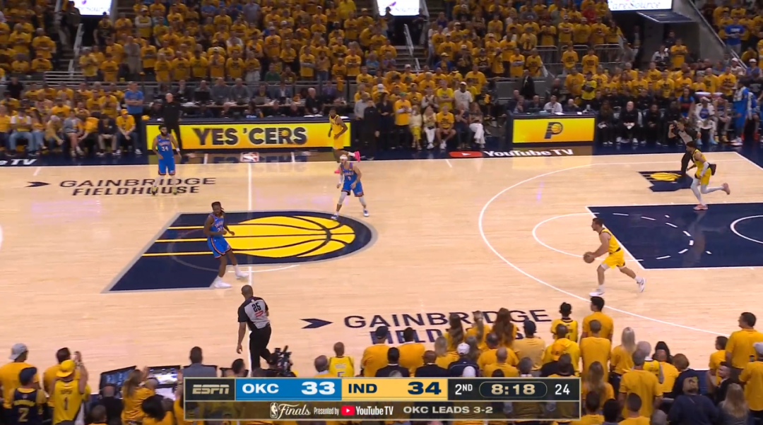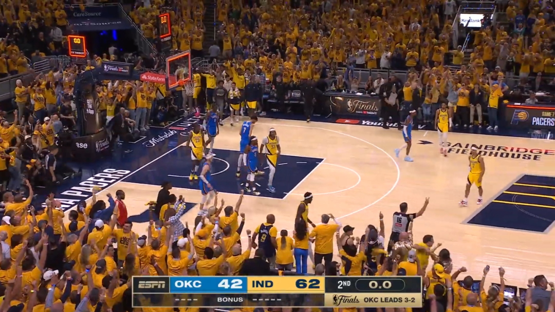 这还不是结束,第二节雷霆又追到了33-34,然后真正残暴的来了:从第二节剩下8分钟到半场结束,步行者又轰了雷霆一波30-9,比分直接来到了64-42,这也是总决赛至今的最大半场分差。