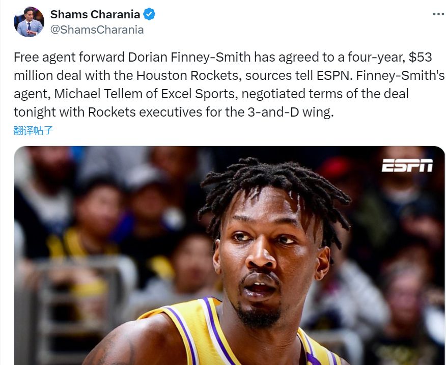 北京时间7月1日,2025NBA自由球员市场开启,火箭又成为赢家,根据ESPN名记查拉涅的报道,火箭和多里安·芬尼-史密斯达成了一份4年5300万美元的合同。火箭抢下这位3D悍将,等于是弥补了狄龙-布鲁克斯留下的防守空缺。火箭还用3年2150万美元签下中锋卡佩拉,使得内线实力变得更加雄厚!