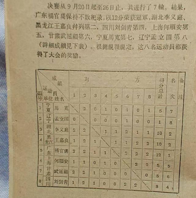 第一次是1959年的首届全国运动会,这届全运会在北京举办,对中国体育界意义重大,而象棋能首次与围棋一同跻身正式比赛项目,更是让整个象棋界都为之振奋——要知道在此之前,象棋多在民间流传,能登上全运会这样的国家级体育舞台,是无数象棋人多年的期盼。当时杨官璘大师34岁,正是棋艺与心态都趋于成熟的黄金时期,可关于他此次夺冠,赛后却出现了“全国赛冠军”与“全运会冠军”的争议。为了厘清事实,我们后来特意查阅了国家体委当时下发的正式文件,文件中明确记载首届全运会象棋项目冠军为杨官璘。此外,《象棋词典》的编撰者们也专门做过考证,最终结论与体委文件一致。